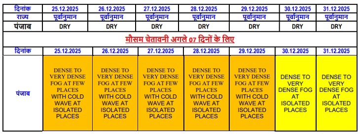 28 दिसंबर – पठानकोट, नवांशहर, मोगा, लुधियाना, बरनाला, मानसा, संगरूर, फतेहगढ़ साहिब और पटियाला में कुछ स्थानों पर घना से बहुत घना कोहरा छाया रह सकता है। वहीं गुरदासपुर, अमृतसर, तरनतारन, कपूरथला, जालंधर और बठिंडा में अलग-अलग जगहों पर घने से बहुत घने कोहरे के साथ शीत लहर चलने की आशंका है।