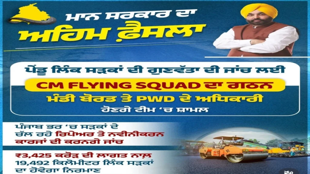 पंजाब सरकार अब राज्य की ग्रामीण सड़कों की हालत सुधारने और काम की क्वालिटी पर नजर रखने के लिए एक नया कदम उठा रही है। मुख्यमंत्री भगवंत मान ने “CM फ्लाइंग स्क्वाड” बनाने का ऐलान किया है, जो पूरे पंजाब में ग्रामीण लिंक सड़कों के निर्माण और मरम्मत के काम की सीधी निगरानी करेगा।